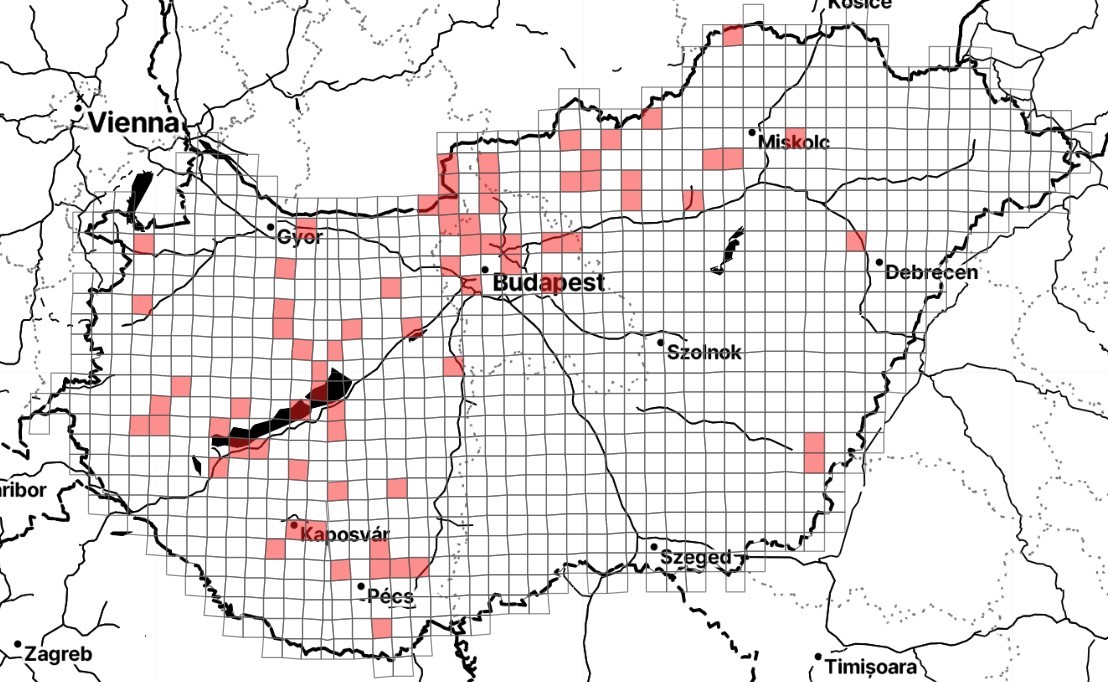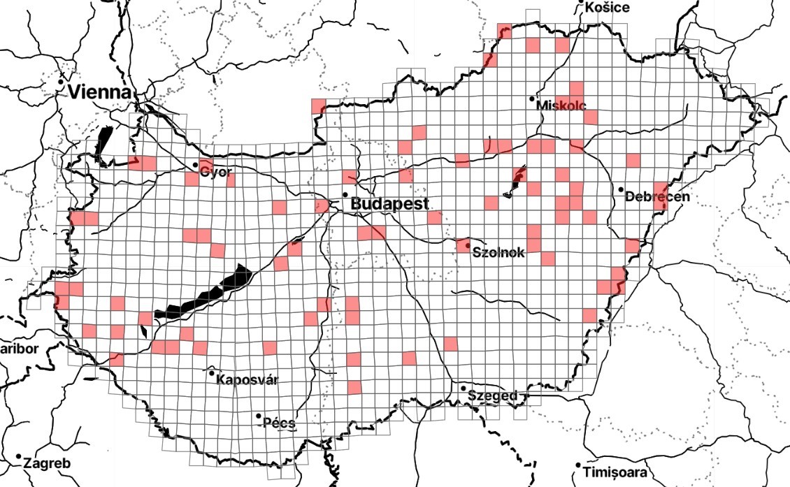 A gyakori ablakosmoly közösségi megfigyelései 10x10 km-es UTM hálón 2000 és 2023 között. Forrás: Lepketérkép, izeltlabuak.hu